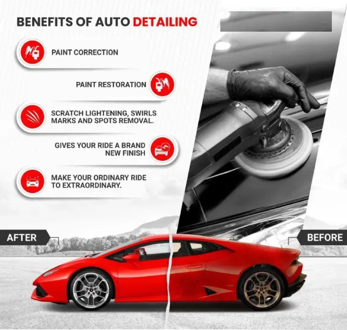 - Enhanced Appearance: Car detailing includes paint restoration through polishing and waxing, which removes surface defects and protects the car paint. Detailing revitalizes your car, making it look brand new and feel posh.